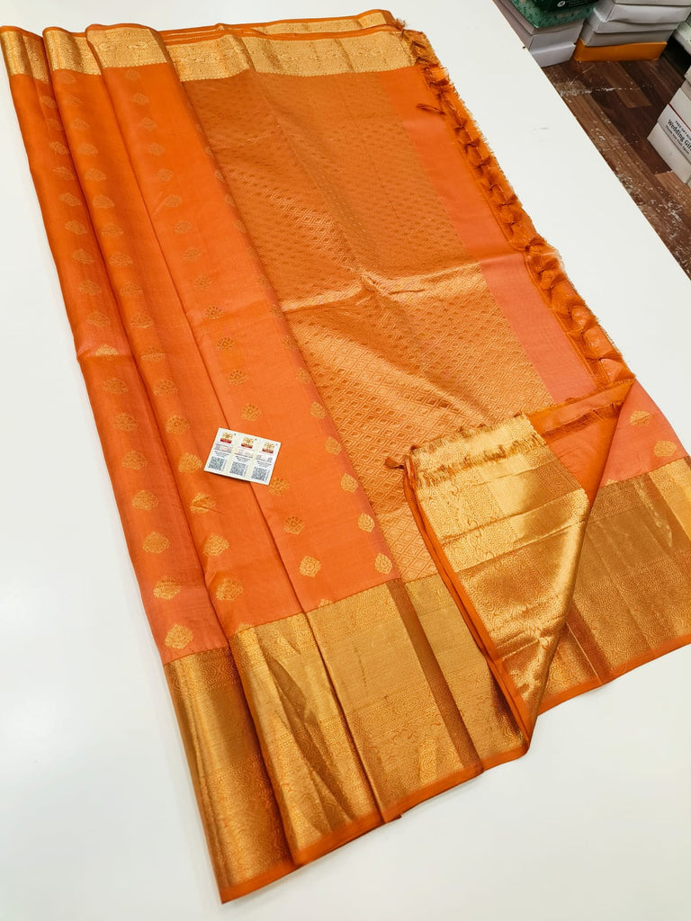 Pure Kanchipuram Silk Saree Orange with designs all over the body and Long Golden Zari Border